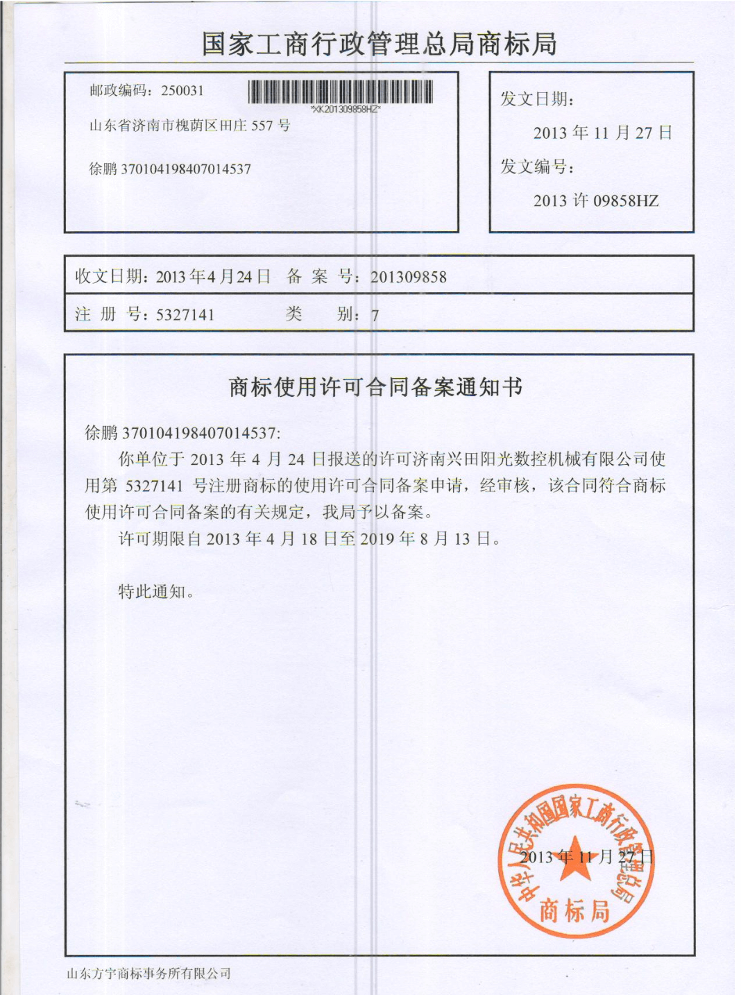 商標(biāo)使用許可合同備案通知書